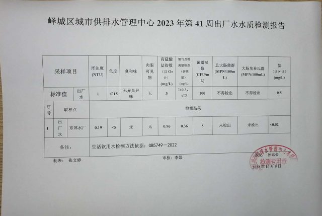 峄城区供排水管理中心2023年第41周出厂水水质检测报告
